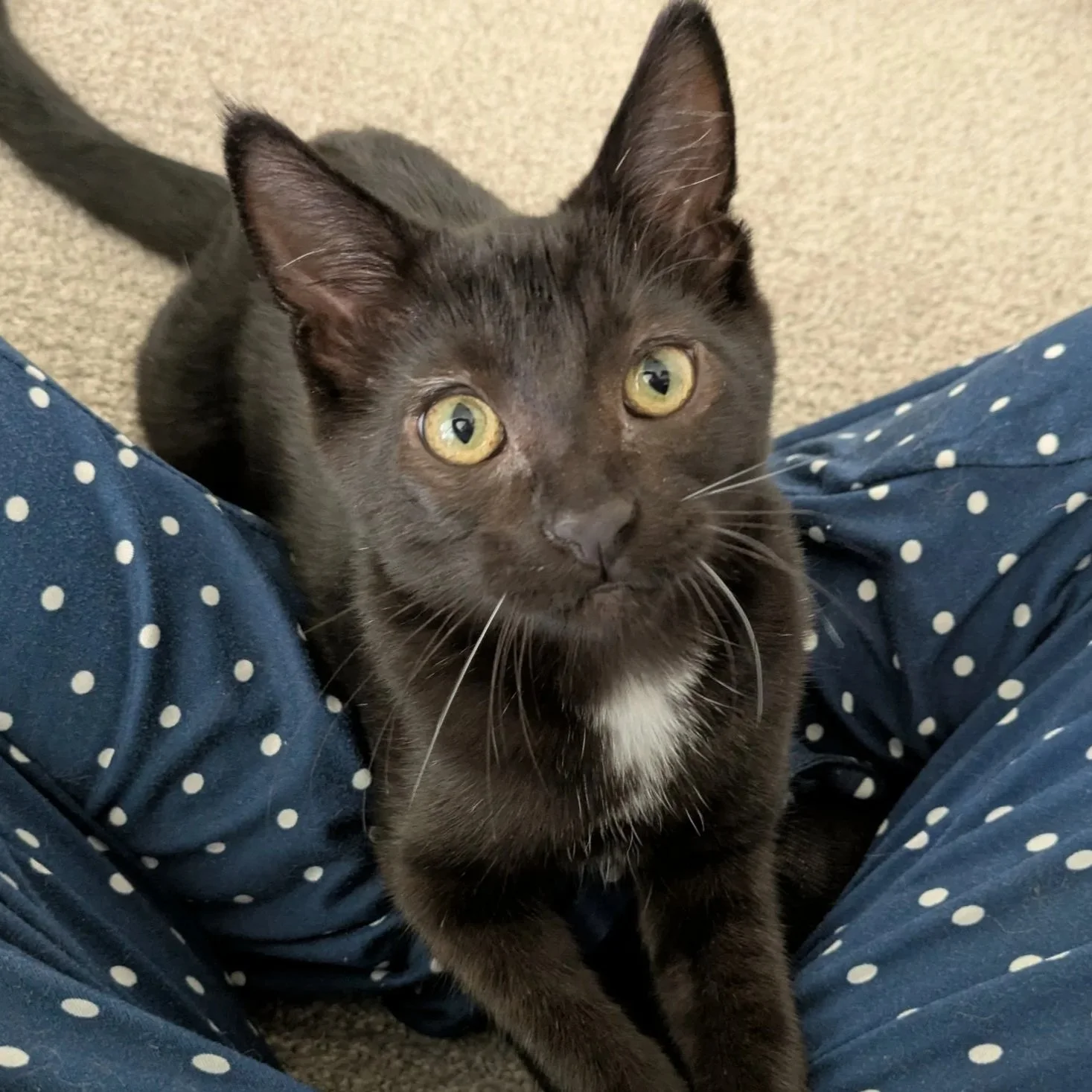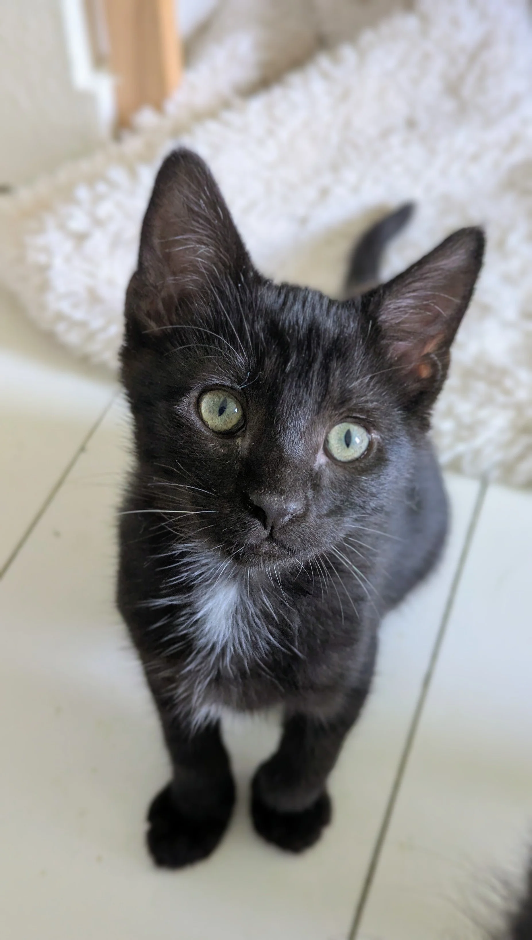 Breed: Domestic ShorthairBronze is a chill and sweet natured boy. He has a shiny black coat, with spots of white on his chest, like he’s wearing a ‘bronze’ medal. Bronze came from a farm with eight other kittens, likely his siblings and cousins. There are five resident kitties in his foster home and he is not bothered by them at all! Bronze will play like a kitten, but he’s often very happy just relaxing and watching the action too. If you’re looking for a laid back and chill kitten to watch Netflix with, Bronze is your guy! Bronze needs to go to a home or be adopted with another cat friendly pet as a companion.