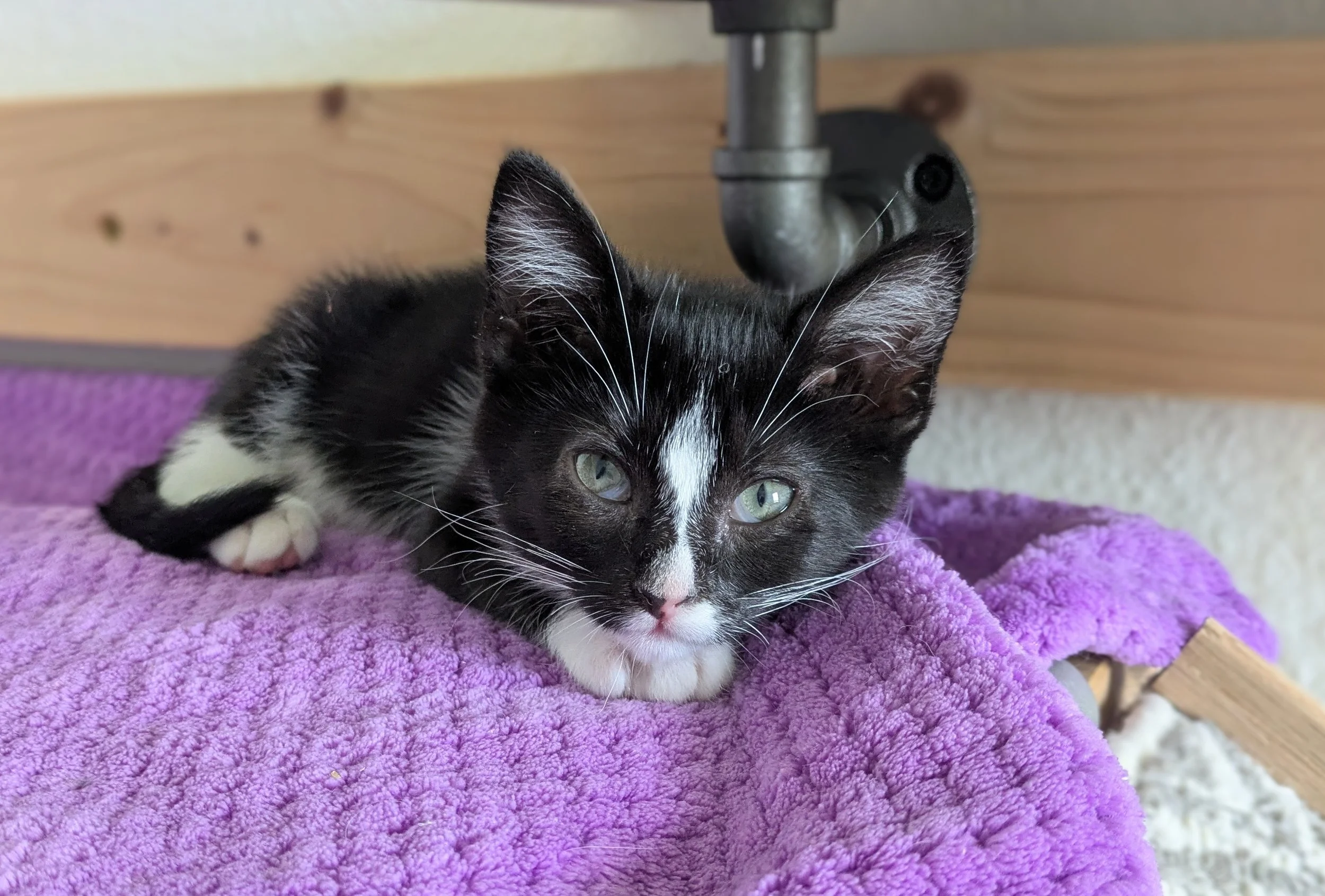 Breed: Domestic Short-hairPeriwinkle is an adorable little tuxedo girl. She came from a farm with eight other kittens, likely her siblings and cousins. Periwinkle is a little shy, but she’s also very sweet, and loves following her foster mom around and rub against her legs! Despite her shyness, she’s very vocal about what she wants, and she loves Churu tubes and treats!! She’s just the perfect little combination of sweet and assertive! Periwinkle needs to go to a home or be adopted with another cat friendly pet as a companion.